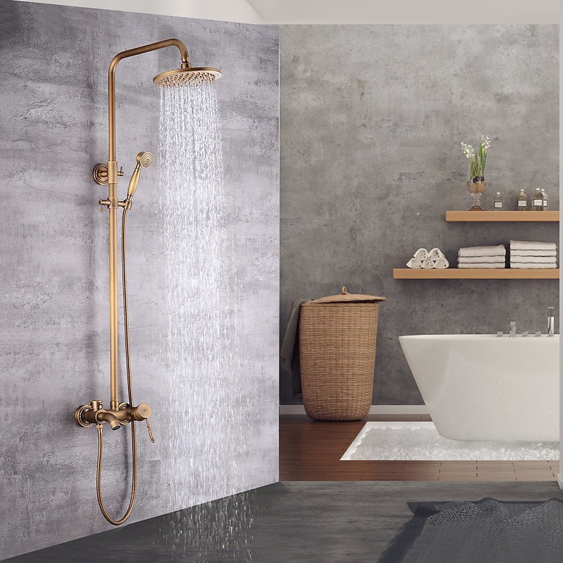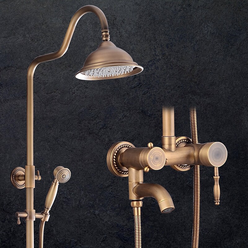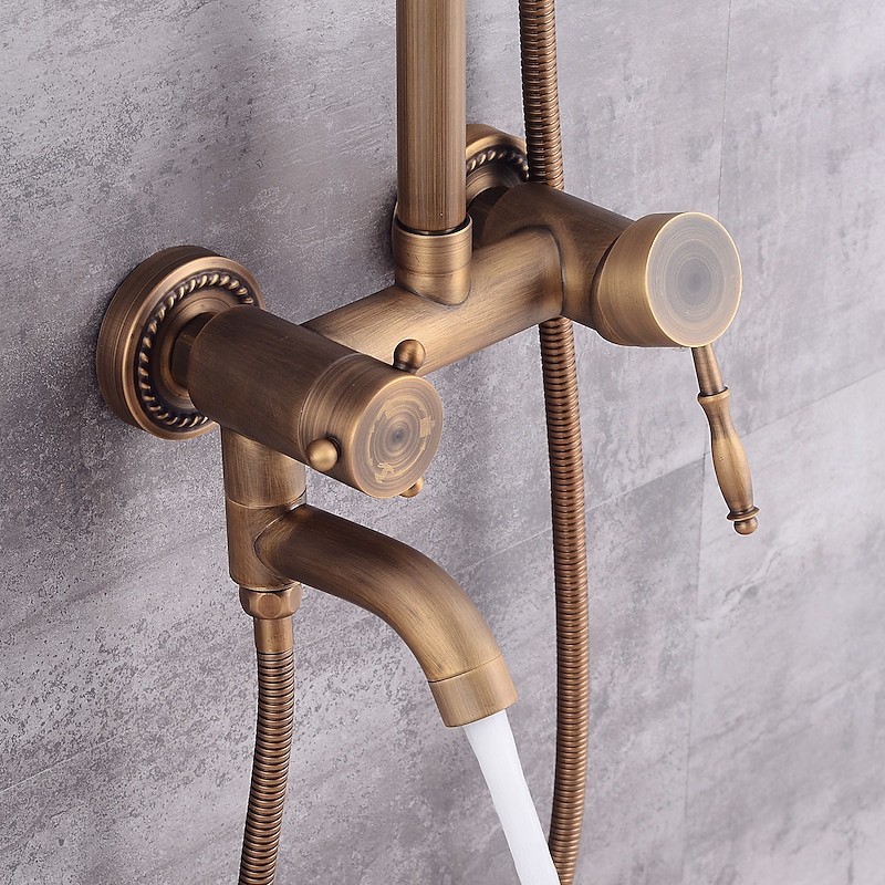 Style:Vintage Style,Country,Features:Waterfall,Multi Spray Shower,Rainfall Shower,pullout,Handshower Included,Faucet Type:Rainfall Shower Head System,Shower System,Shower Faucet,Installation Type:Mount Outside,Cold and Hot Switch:Yes,Valve Type:Ceramic Valve,Finish:Antique Brass,Special selected products:COD,