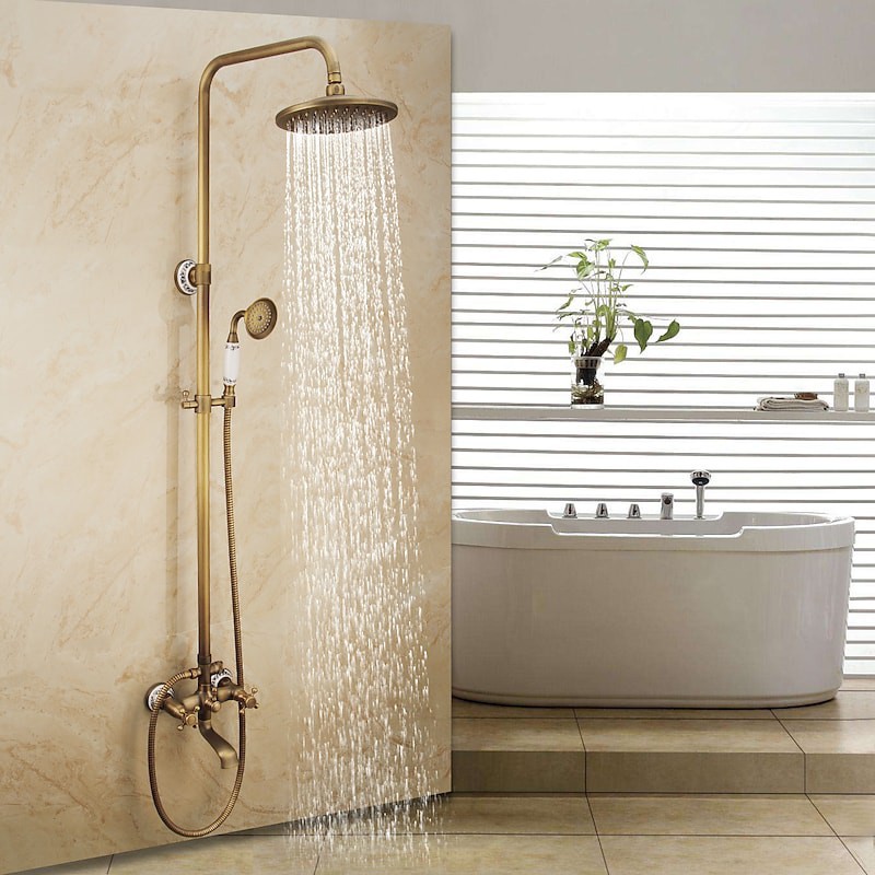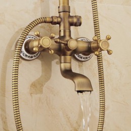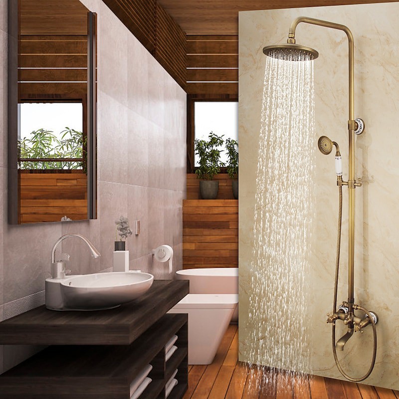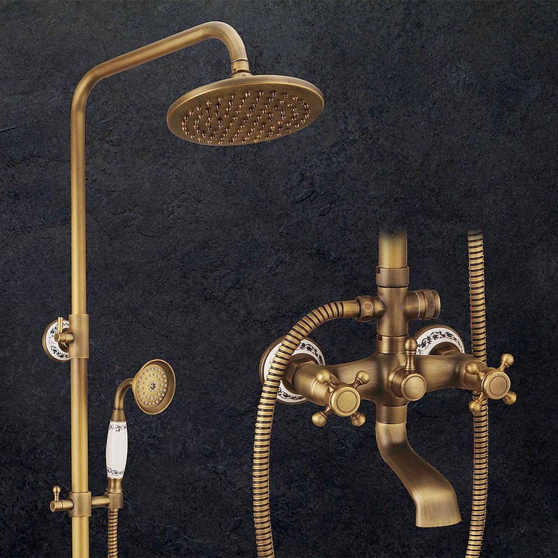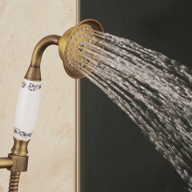 Style:Vintage Style,Country,Features:pullout,Handshower Included,Waterfall,Faucet Type:Shower System,Installation Type:Mount Outside,Cold and Hot Switch:Yes,Valve Type:Ceramic Valve,Finish:Antique Brass,