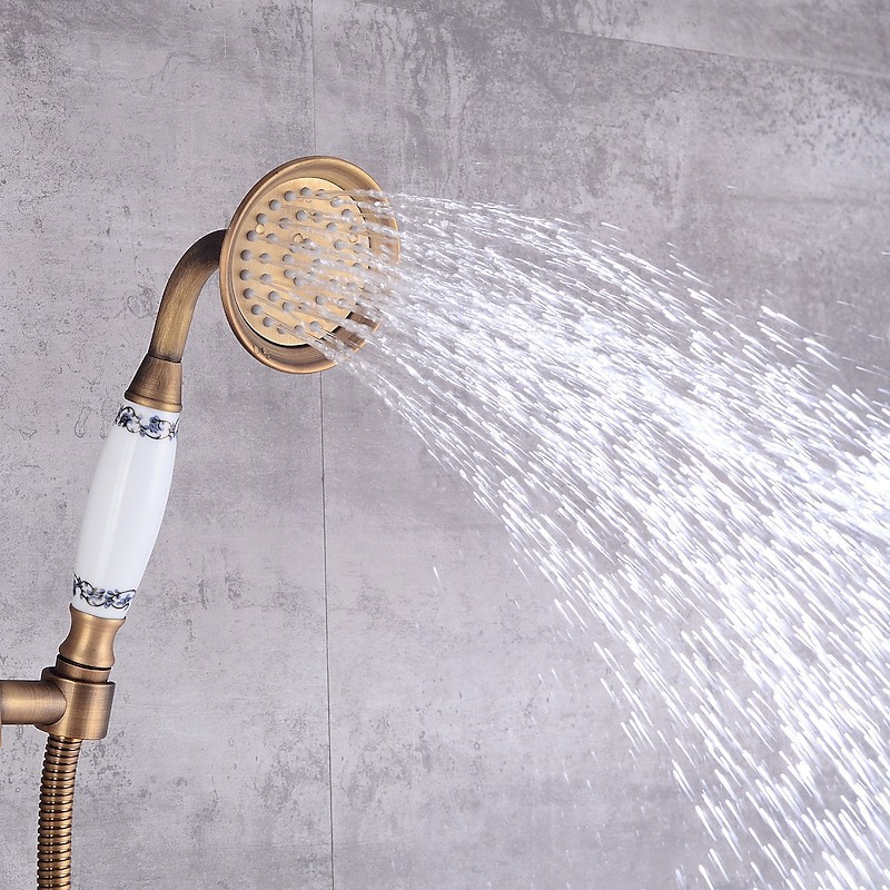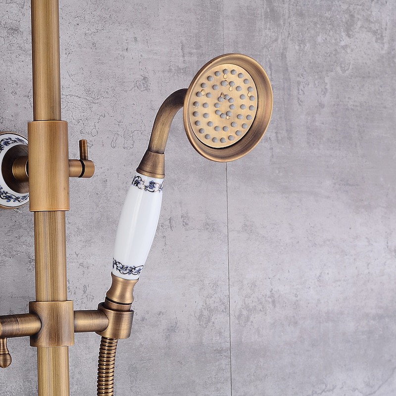 Style:Vintage Style,Country,Features:pullout,Handshower Included,Waterfall,Faucet Type:Shower System,Installation Type:Mount Outside,Cold and Hot Switch:Yes,Valve Type:Ceramic Valve,Finish:Antique Brass,