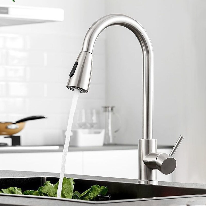 Type:Standard Spout,Pull-out/Pull-down,Tall/High Arc,Style:Minimalist,Modern Contemporary,Features:Rotatable,Multi-function,Pull out,Faucet Type:Kitchen faucet,Installation Type:Centerset,Cold and Hot Switch:Yes,Valve Type:Ceramic Valve,Finish:Stainless Steel,Installation Holes and Handles:Single Handle One Hole,Water Pressure (Mpa):0.2-1,